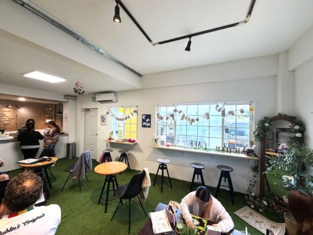 室内なのにまるでガーデンパーティーに招かれたよう店内にはテーブル席のほかロースタイルで床に座ってくつろげる席や、ひとりでも気軽に利用できる窓際のカウンター席もそろっているのでその日の気分に合わせて好きなスタイルでくつろげます。さらに毎月ワークショップやイベントも開催され地域のコミュニティスペースとしても親しまれているそうです。
