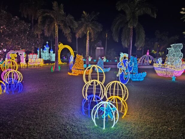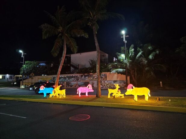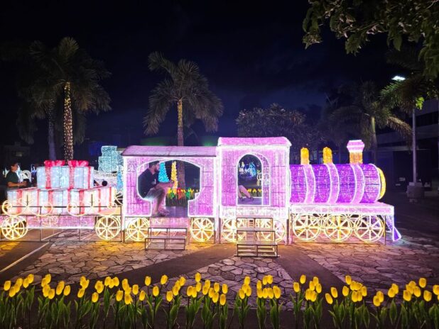 ホテルロード沿いにあるグアム政府観光局前にも色鮮やかなイルミネーションが輝き、訪れる人々を温かく迎えてくれます。ここからタモン中心地へと続く中央分離帯にはクリスマスの華やかなデコレーションがずらりと並び、歩くだけで心が弾むような光景が広がります。南国グアムならではのカラバオ(水牛)やラッテストーンといった伝統的なモチーフも光で表現されておりユニークなイルミネーションを楽しむことができます。