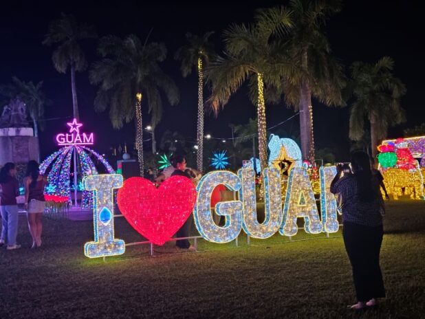 人気のI LOVE GUAMイルミネーション前では、家族連れや観光客が次々と写真を撮影しておりクリスマスカードにぴったりの一枚が残せそうです。