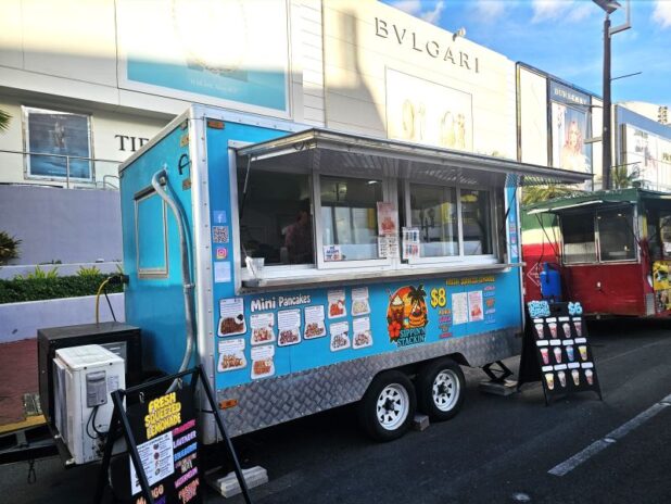 色とりどりのフードトラックが立ち並び、手軽に楽しめるB級グルメが勢ぞろい。中にはフードトラックからスタートし人気のあまり店舗を構えるまでに成長したローカル店もあります。気になる料理を次々とはしごできるのも、このマーケットの醍醐味です。こちらのフードトラックでは、フレッシュレモネードとミニパンケーキを販売しています。クッキー&クリームやペパーミントホットココアなど、まるでアイスクリームショップのようなユニークなフレーバーがずらり、選ぶ時間も楽しくなるラインナップです。