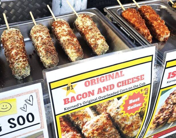 食べ歩きにぴったりのコーンにはベーコン&チーズやバーベキュー味といった定番のほか、ソースとマヨネーズに海苔を合わせた“たこ焼き風”ジャパニーズスタイル、さらにバターにココナッツ&ブラウンシュガーをのせたデザート系まで多彩なトッピングが勢ぞろい。