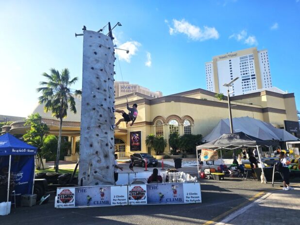 会場の一角には仮設とは思えないほど本格的なロッククライミングウォールがそびえ立っています。腕や脚、体幹をしっかり使うため短時間でも達成感と爽快感は抜群。イベントでも特に人気のアクティビティとなっています。