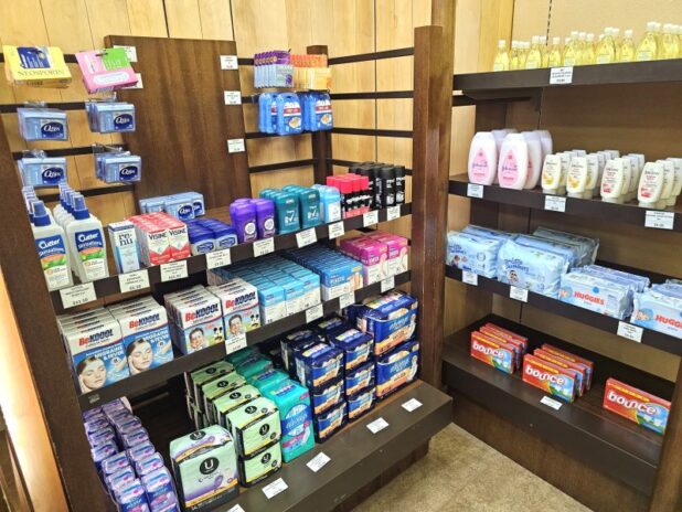 もしもの時に頼れるアイテム、冷えピタ風ジェルシートや絆創膏、生理用品、赤ちゃんのおしりふきなども販売されているのでわざわざスーパーや薬局に行かなくても大丈夫。